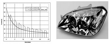 圖2: (a) H1 bulb(55w)啟動電流示意圖; (b) 汽車前燈示意圖 表1:法規(guī)強(qiáng)制要求燈負(fù)載(括號中為北美法規(guī)要求)
