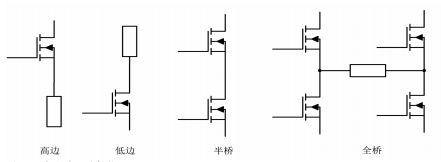 驅(qū)動類型主要是從驅(qū)動負(fù)載的電路拓?fù)浼右钥紤],主要有高邊驅(qū)動、低邊驅(qū)動、半橋驅(qū)動和全橋驅(qū)動(包括兩相全橋和三相全橋)四種,如圖8所示。