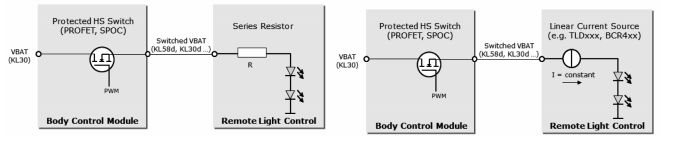 目前在汽車領(lǐng)域應(yīng)用中存在白熾燈和LED照明都存在的情況,基于平臺化設(shè)計的理念,需要兼容白熾燈和LED兩種負(fù)載。 從前文敘述可知,一般使用高邊開關(guān)來驅(qū)動白熾燈,也可以用高邊開關(guān)Profet來驅(qū)動LED,但是因為LED的驅(qū)動電流較小,需要選用導(dǎo)通電阻較大的功率管。這種直接采用限流電阻恒壓驅(qū)動的方式多針對LED電流較小的應(yīng)用,在LED電流較大時,電阻上消耗的功率較大,照明效率降低。此外,這種簡單恒壓驅(qū)動方式不能抑制電壓波動帶來的影響,容易造成LED的亮度變化,因此這種驅(qū)動方式對亮度比較敏感的應(yīng)用不適用。從LED伏安特性來看,正向電壓大于導(dǎo)通電壓VF之后,微小的電壓變化會導(dǎo)致較大的電流變化,從控制的角度來看,控制電流更容易構(gòu)建一個穩(wěn)定的控制系統(tǒng);另外從光通量的角度出發(fā),光通量由正向電流決定,所以控制電流更具有光學(xué)物理意義。為了消除電壓波動帶來的影響,采用線性恒流源控制輸出電流,高邊開關(guān)做開關(guān)使用。如圖9所示。圖9所示的驅(qū)動拓?fù)涓嗟氖强紤]和白熾燈驅(qū)動做兼容,便于平臺化設(shè)計。