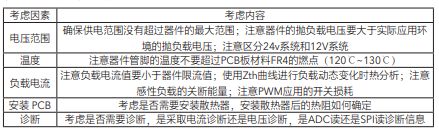 選擇功率器件主要是對功率器件工作時靜態(tài)和動態(tài)的電應(yīng)力進(jìn)行計算和評估。進(jìn)行這些計算主要需要考慮的外部因素包括供電電壓、溫度、負(fù)載和安裝方法,如表5所示。