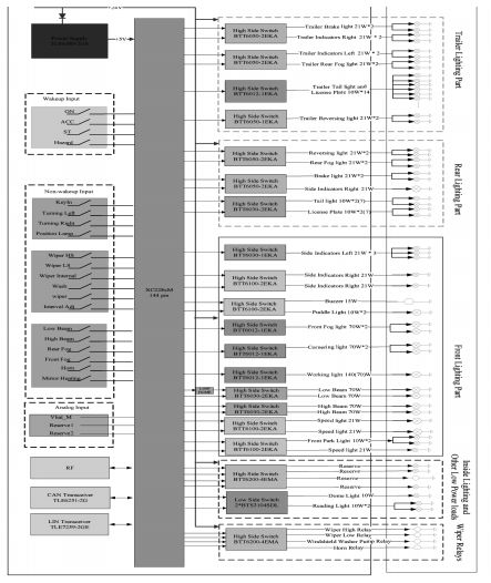 BCM是車身(包括24V商用車和12V乘用車)電子的重要內(nèi)容,BCM是Body Control Module的縮寫。主要任務(wù)之一是燈光控制,包括前燈、側(cè)燈、尾燈和室內(nèi)燈,以及控制一些加熱附件、雨刮繼電器等。另外可選的任務(wù)是包含網(wǎng)關(guān)功能,處理整車通訊信息。本文主要討論BCM系統(tǒng)的硬件設(shè)計,設(shè)計的原則是根據(jù)負(fù)載特性選擇不同的驅(qū)動方式,達(dá)到控制相關(guān)負(fù)載的目的。此外,本文對功率損耗分析、診斷等關(guān)鍵內(nèi)容進(jìn)行了詳細(xì)闡述。
