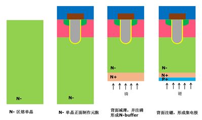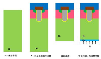 NPT:采用輕摻雜N- 區(qū)熔單晶硅作為起始材料,先在硅面的正面制作元胞并用鈍化層保護(hù)好,之后再將硅片減薄到合適厚度。最后在減薄的硅片背面注入硼,形成P+ collector, 激活雜質(zhì)后再淀積金屬鋁。區(qū)熔單晶硅成本大約為外延片的50%。