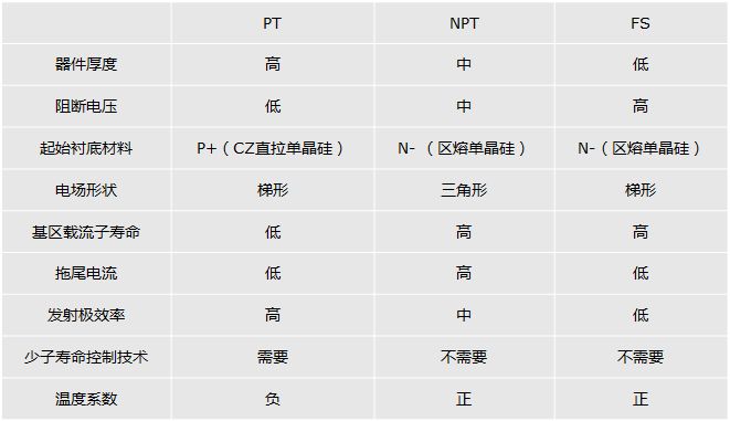 綜上所述,PT, NPT,FS 型IGBT主要區(qū)別可以歸納為下表: