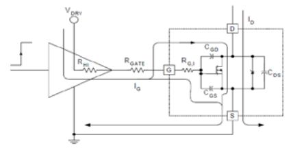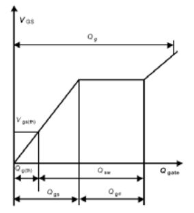 MOSFET 開通時,預(yù)驅(qū)動輸出驅(qū)動電流I(G),首先給電容C(GS)充電,門級電壓超過閥值電壓V(gs-th)時MOSFET導(dǎo)通,驅(qū)動負載的電流I(D)開始增大;電容C(GS)充滿后電門級電壓到達米勒平臺,再給電容C(GD)充電,這時會有一定時間的穩(wěn)壓,直到電容C(GD)充滿電,保證門級電壓遠高于閥值電壓,即保證MOSFET安全導(dǎo)通。整個充電過程需要的電荷為Q(g)。