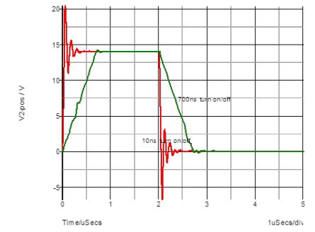 利用電路仿真軟件,如下圖所示,綠色曲線是700ns開關(guān)速度的門級電壓波形,紅色曲線是10ns開關(guān)速度的電壓波形。開關(guān)速度太快會導(dǎo)致MOSFET的門級電壓出現(xiàn)過沖和震蕩,一方面過沖的電壓會對電路造成損壞,另一方面,太快的斜率和電壓震蕩都會產(chǎn)生更多的電磁干擾。