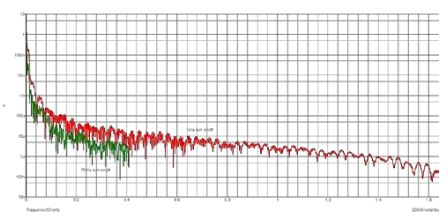 下圖的綠色曲線是700ns開關(guān)速度的頻譜分析,紅色曲線是10ns開關(guān)速度的頻譜分析,10ns的開關(guān)速度會產(chǎn)生更多的電磁干擾。