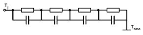 圖2:(b)π型局部網(wǎng)絡(luò)模型回路(Foster model)如圖1(a),T型模型的結(jié)構(gòu)比較真實(shí)的反應(yīng)出真實(shí)的熱阻熱容物理結(jié)構(gòu)。如果散熱系統(tǒng)中每一層的材料的特性參數(shù)都是已知的時(shí),可以通過理論計(jì)算公式來建立這種模型的結(jié)果。但是,在熱傳播中很難確定熱傳播在每一層中的分布,因此實(shí)際建模時(shí)一般不使用T型回路。