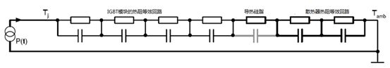 此外還需要考慮到散熱器以及模塊與散熱器接觸面的瞬態(tài)熱阻,同時(shí)IGBT模塊外殼和端子也有少量的對(duì)流熱傳導(dǎo),但是對(duì)流熱傳導(dǎo)的影響相對(duì)底殼的熱傳導(dǎo)非常小可忽略。由此整個(gè)散熱系統(tǒng)合并的串聯(lián)π型網(wǎng)絡(luò)模型可由圖(3)表示。