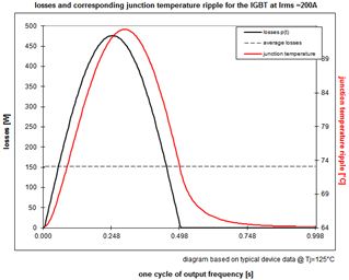 IGBT模塊動(dòng)態(tài)熱阻的特性導(dǎo)致驅(qū)動(dòng)器中三相逆變橋中的IGBT在不同輸出頻率下,所對(duì)應(yīng)的結(jié)溫波動(dòng)幅度也不同。在一個(gè)半波周期內(nèi),一個(gè)半橋中其中一個(gè)橋臂的IGBT處于連續(xù)帶載工作,在IGBT開關(guān)頻率不變下,輸出頻率越低,一個(gè)橋臂的連續(xù)帶載時(shí)間越長(zhǎng),一個(gè)半波內(nèi)總損耗能量越大。同時(shí)由于IGBT模塊動(dòng)態(tài)熱阻在一般在1秒內(nèi)迅速上升,因此輸出頻率越低,IGBT的結(jié)溫波動(dòng)就越大。