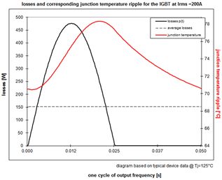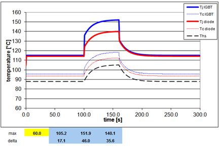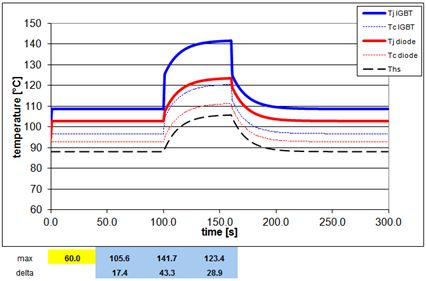 IGBT模塊和散熱器的動(dòng)態(tài)熱阻特性允許模塊短時(shí)間過載工作。合理的利用動(dòng)態(tài)熱阻特性可使電機(jī)功率輸出性能提高,但同時(shí)必須在設(shè)計(jì)時(shí)精確的進(jìn)行仿真計(jì)算,動(dòng)態(tài)的控制不同輸出頻率下的電流限值。Infineon公司所提供的IPOSIM仿真工具,具有對(duì)穩(wěn)態(tài)下和動(dòng)態(tài)循環(huán)下的結(jié)溫仿真功能,使設(shè)計(jì)者在系統(tǒng)設(shè)定和模塊選型時(shí)能更加準(zhǔn)確和安全。(英飛凌igbt廠家)