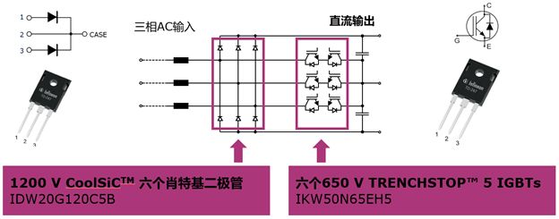 本文介紹一種基于”T”型三電平演化而來的Vienna整流器,以及怎樣使用英飛凌新一代650 V單管IGBT和1200 V SiC肖特基二極管,實(shí)現(xiàn)系統(tǒng)高效率和高功率密度。如下圖1,是經(jīng)典的”T”型三電平Vienna整流器拓?fù)鋱D,整流部分采用1200 V SiC 二極管, 鉗位開關(guān)管采用2顆650 V IGBT 反向串聯(lián),并連接BUS 母線中點(diǎn)。