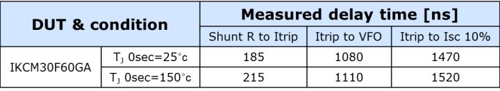 同樣以CIPOS MINI系列的IKCM30F60GA為例,其內(nèi)部驅(qū)動器相應(yīng)短路信號延遲時間為1.47μs,測試條件為Tj=25°C,VDD=15V。