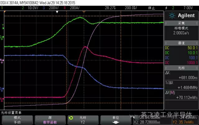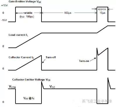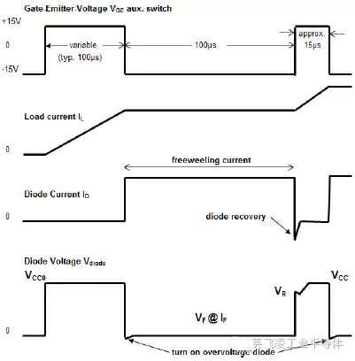 圖2-2:Diode的雙脈沖測試波形圖圖3給出了雙脈沖測試過程中,IGBT的開通過程和關斷過程的波形。損耗可以通過CE電壓和導通電流的乘積后的積分來獲得。需要注意的是電壓探頭和電流探頭需要匹配延時,否則會引起比較大的測試誤差。在用于數據手冊的測試平臺中,常見的電流探頭是PEARSON探頭,而實際系統(tǒng)的母排中,很難裝入PEARSON探頭,更多的采用Rogowski-coil。需要注意的是Rogowski-coil 的延時會比較大,而且當電流變化率超過3600 A/μs時,Rogowski-coil 會有比較明顯的誤差。關于測試探頭和延時匹配也可同儀器廠家確認。