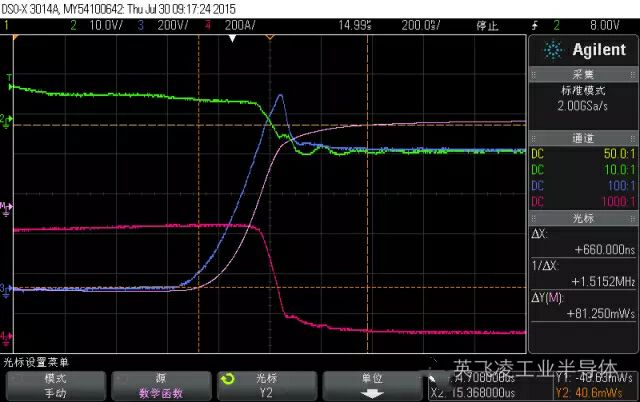 圖3-1 IGBT關斷過程DUT:FF600R12ME4; CH2(綠色)- VGE,CH 3(藍色)- ce,CH4(紅色)- Ic