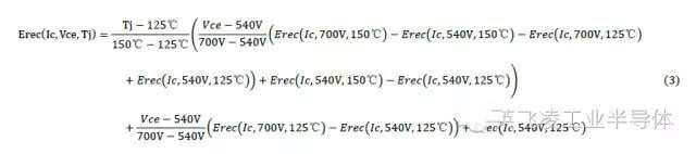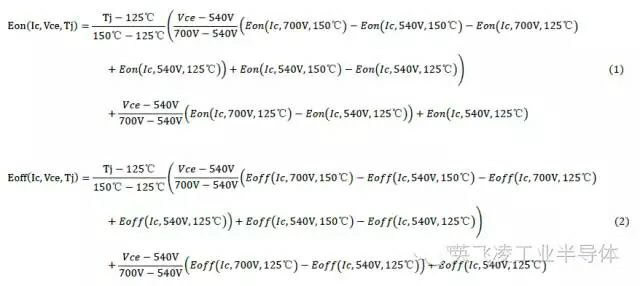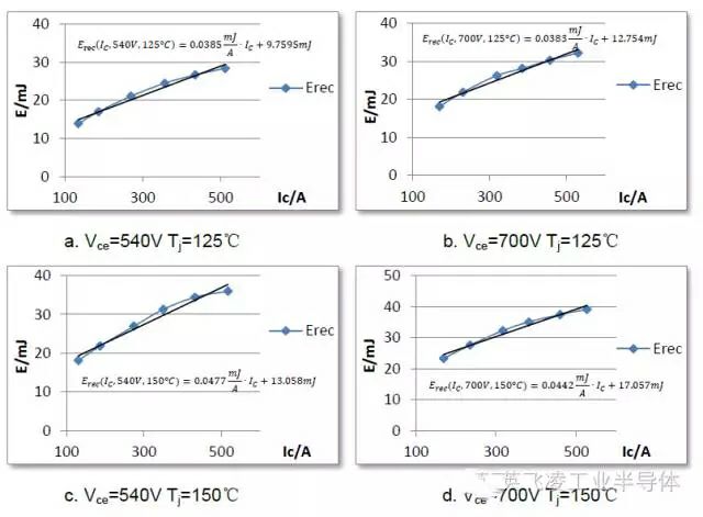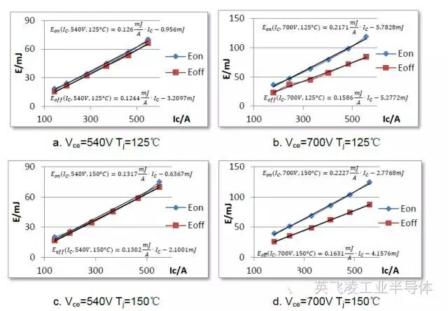 圖4:在不同的電流輸入條件下,以電壓和溫度為給定條件的IGBT的開關損耗曲線依據圖4給出的損耗測試曲線,可以依據線性等效的方法得到IGBT的開通損耗和關斷損耗在電流,電壓,結溫下的推導公式。