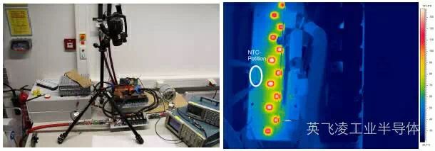 圖1:左-測溫試驗臺,由IGBT模塊,電源,數據采集系統,冷卻設備和測溫設備組成 右-被測IGBT模塊的紅外圖像,只加熱二極管芯片